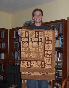 Dan with his tablecloth. Sarah went shopping at a fair trade store near them and came back with all kinds of treasures for all of us. Well, all of us but Linda and Matt.