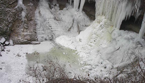 At the foot of the frozen falls, you can see big chunks of ice that have fallen off.